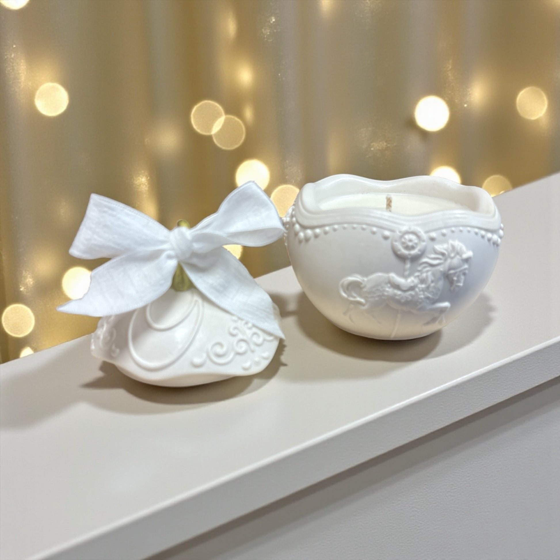 À l'intérieur se trouve une bougie en cire de soja coulée à la main (200g pour le modèle "Perles", 220g pour le modèle "Cheval") avec une mèche en coton. Son parfum doux et délicat, "Poudre de Lune", est un mélange féérique de citron doux, de jasmin et de musc.