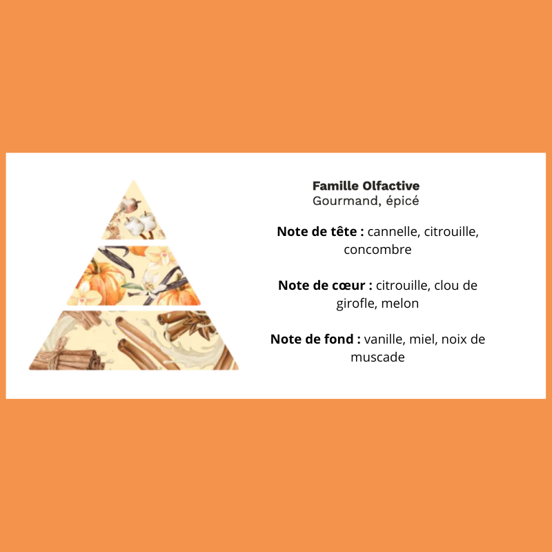 Au cœur de cette composition, la citrouille se dévoile pleinement, accompagnée de clou de girofle et de melon. Ces notes créent une harmonie délicieuse, où la douceur de la citrouille se marie à l'épice réconfortante du clou de girofle, tandis que le melon ajoute une touche juteuse et rafraîchissante.