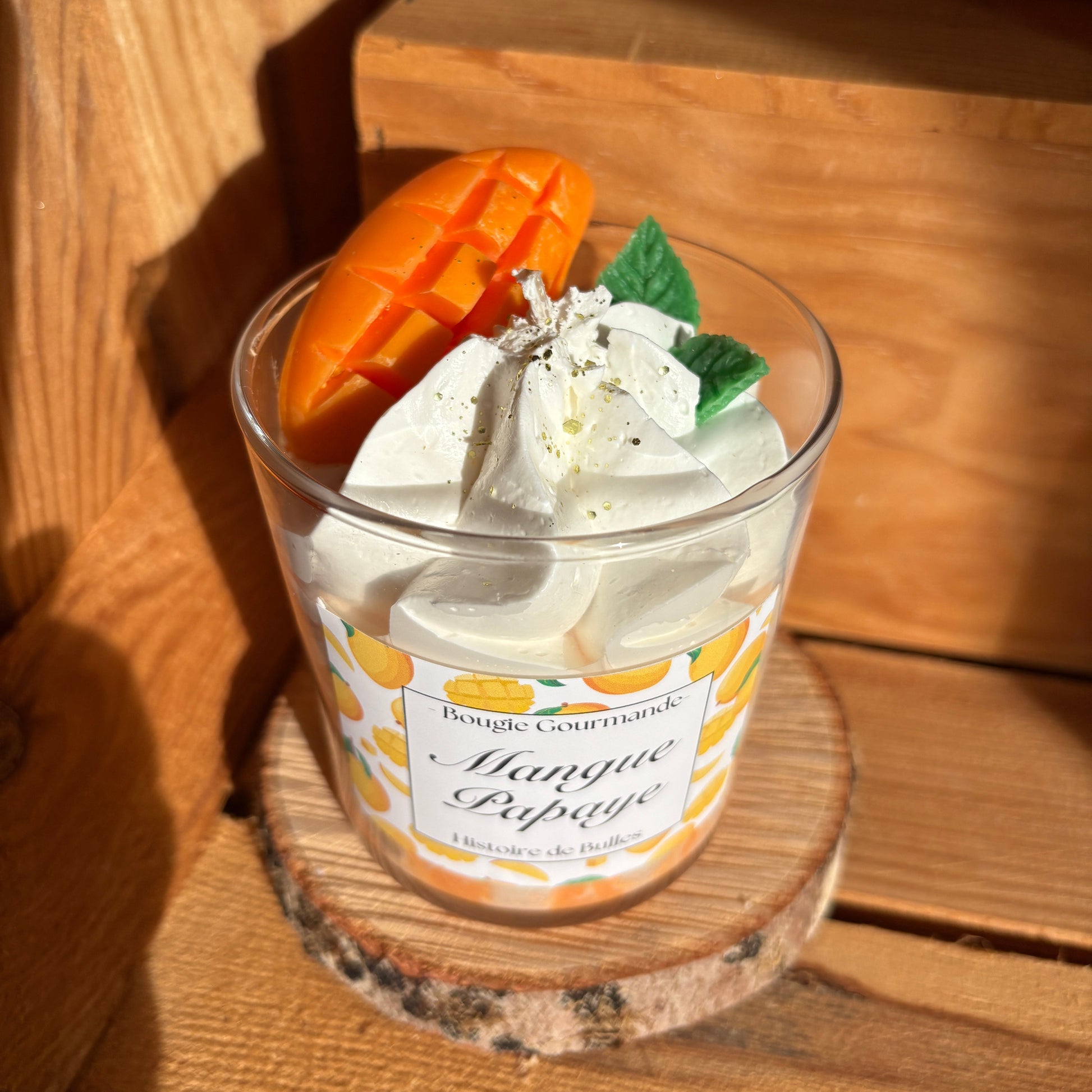 Plongez dans une évasion tropicale avec ma bougie gourmande Mangue Papaye, une fragrance fruitée, exotique et ensoleillée.