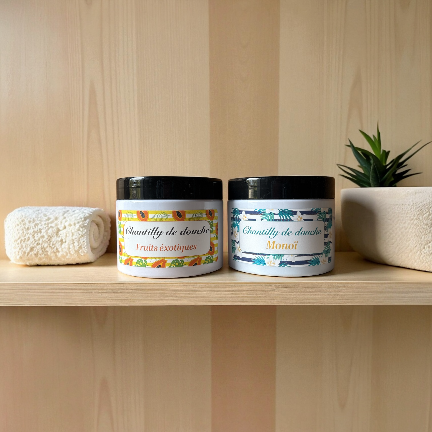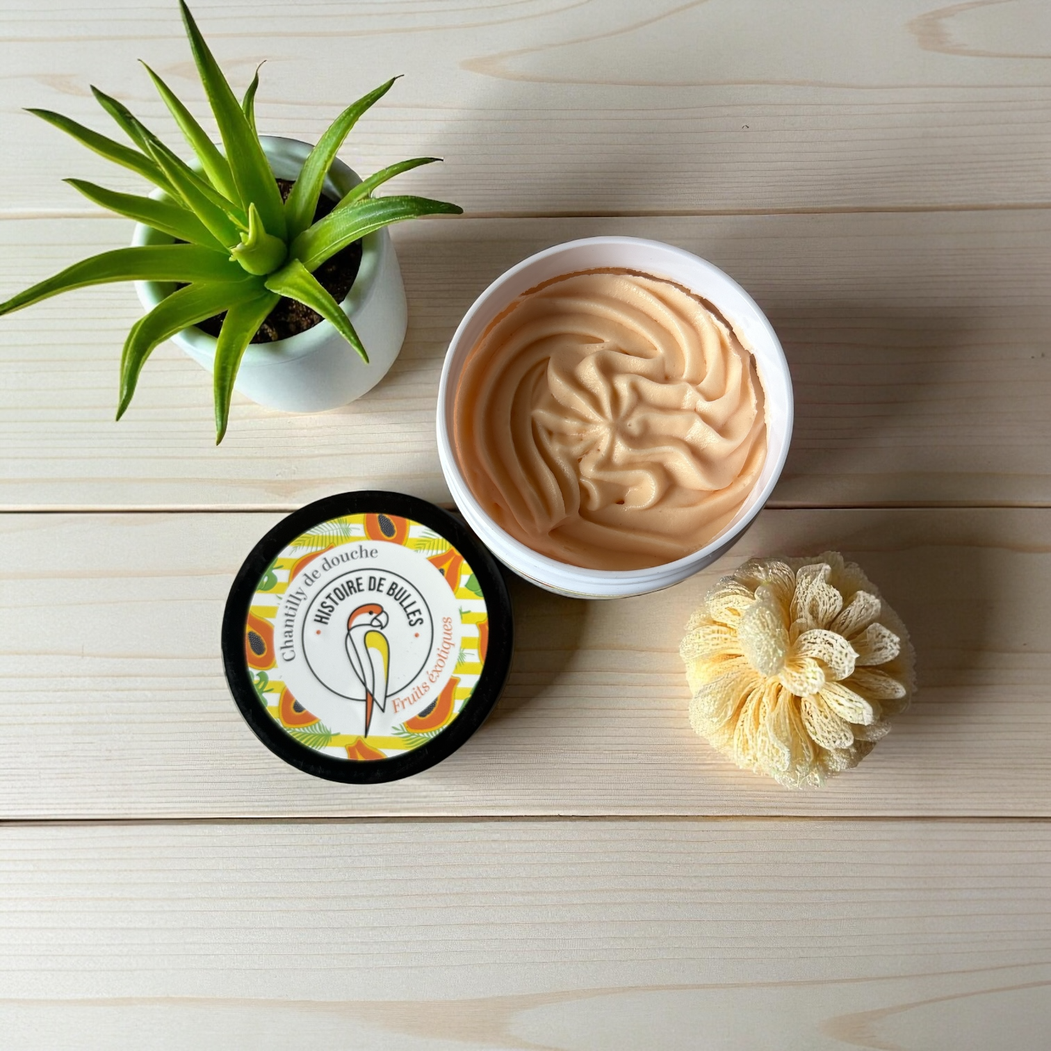 Réalisée à partir d'un savon surgras saponifié à froid (Savon N°7), ma chantilly de douche, grace à sa texture onctueuse, nettoie la peau tout en douceur et la laisse délicatement parfumée.