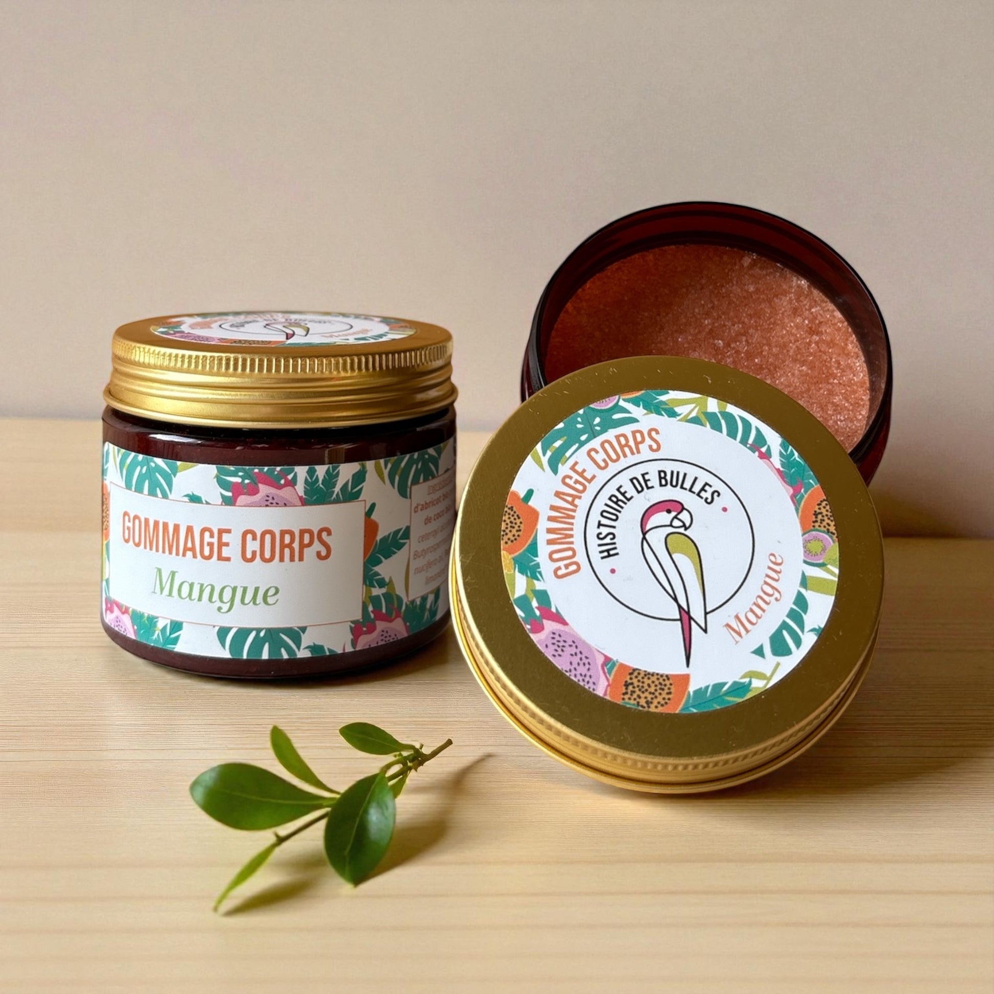 Gommage pour le corps à base de sucre de canne parfumé avec un parfum de Grasse à la mangue. Fondant et gourmand ce gommage laissera votre peau douce, hydratée et agréablement parfumée.